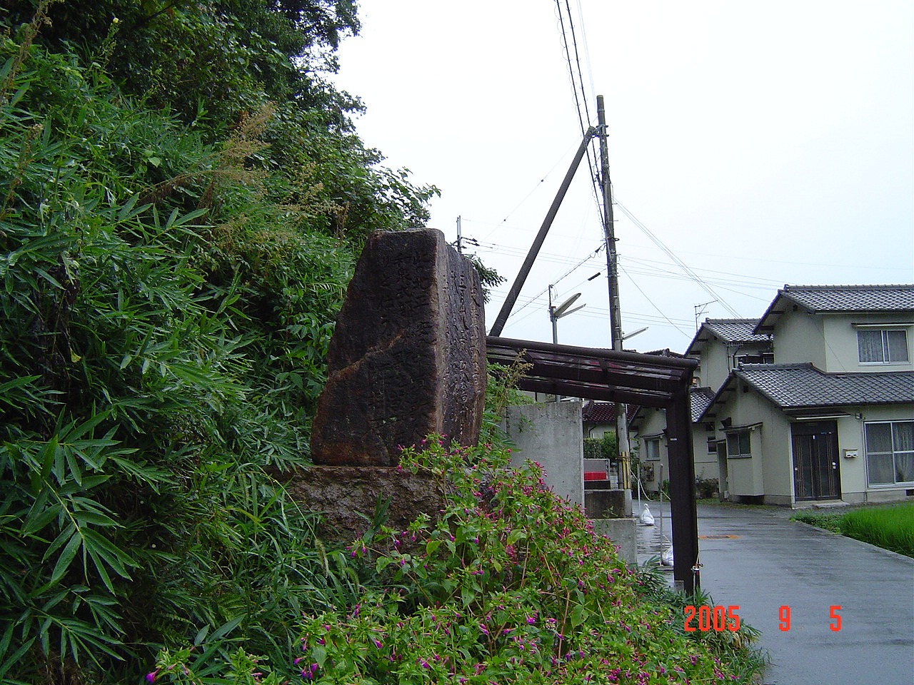 写真の石碑の正面には「史蹟歌書ヶ渕 青山八景歌書秋月 秋の夜乃月に契りし深ければ歌もつもりて淵と也けり」,側面には「此の北平安の中頃歌人和泉式部が歌を詠みたりと伝う腰掛石」とある。