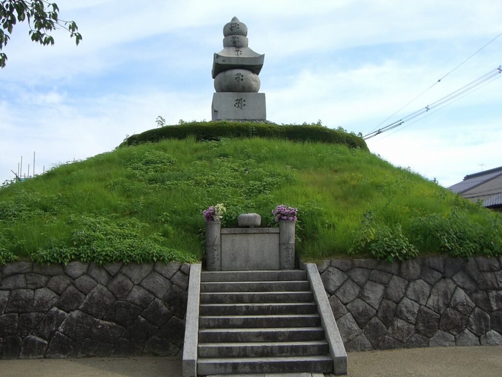塚の上に建つ五輪の石塔は,寛永二年の古絵図にも描かれているという。長い間,大切に供養されてきた。ここは記憶に留めるべき戦争の史跡である。