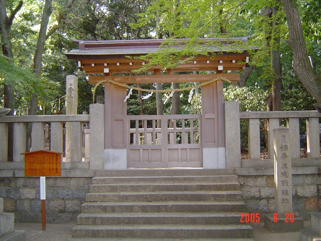 神戸市中央区多聞通3丁目に鎮座する湊川神社に「嗚呼忠臣楠子之墓」(大楠公御墓所)と「楠木正成戦歿地」(大楠公御殉節地)がある。