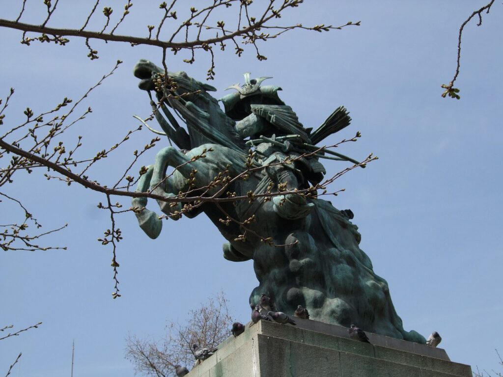 写真は桜が咲く前に撮影したので今一つだが,今年も美しく咲き,そして散ったに違いない。この光景は大楠公・楠木正成にこそ相応しい。彼にとって最後の戦いとなる湊川の戦いは,この地の周辺で激戦が繰り広げられた。像のようなポーズも一瞬のうちにはあったかもしれない。像の建設は大楠公六百年祭を挙行した昭和10年で,国威発揚の気運が高まっていた時代だ。