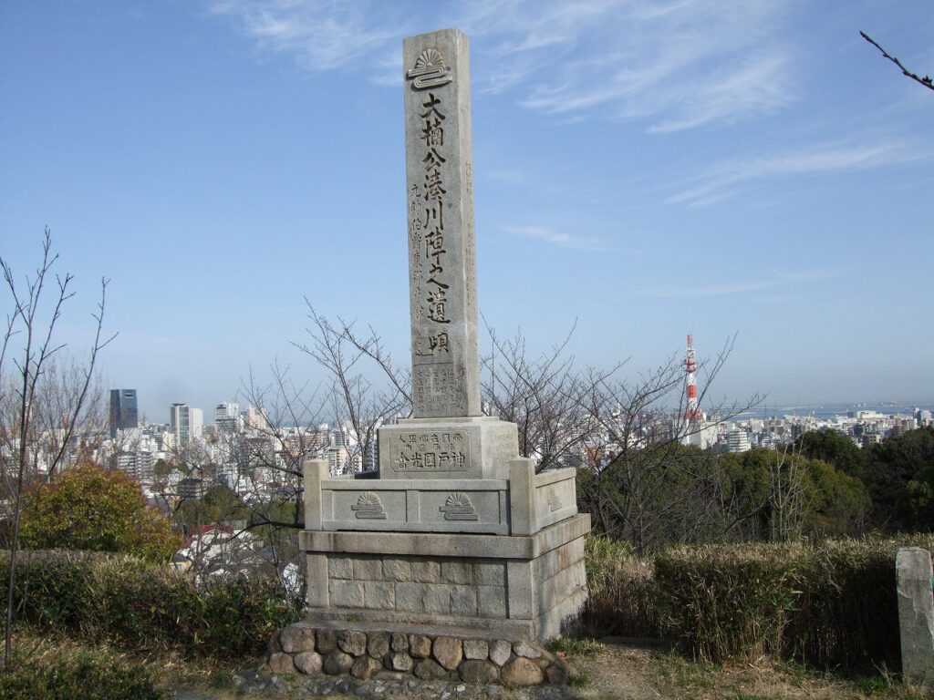 こちらは元帥伯爵東郷平八郎の筆によるものである。陣地に相応しく,見晴らしのよい場所だ。碑には阪神・淡路大震災で破損し修復された跡も残る。会下山公園には,当時,仮設住宅が立ち並んでいたということだ。