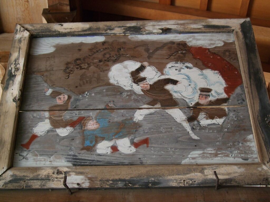 拝殿に日清戦争を描いたと思われる絵馬が掲げられている。「明治廿八」の文字をかすかに読むことができる。清国兵を日本兵が懲らしめているような絵柄である。