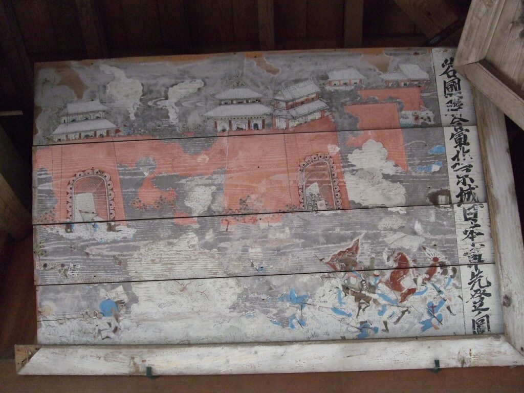 拝殿に北清事変を描いたと思われる絵馬が掲げられている。「各國聨合軍北京城日本軍先登ノ圖」と読むことができる。傷みが激しいが北京城の朱壁はよく残っている。