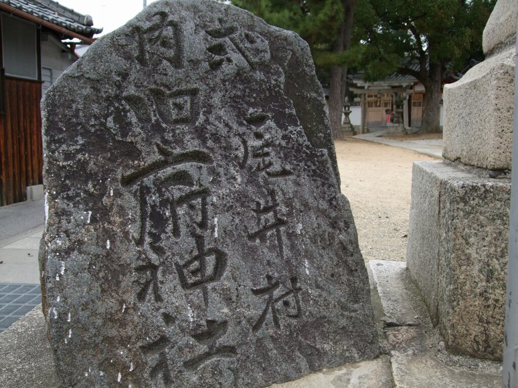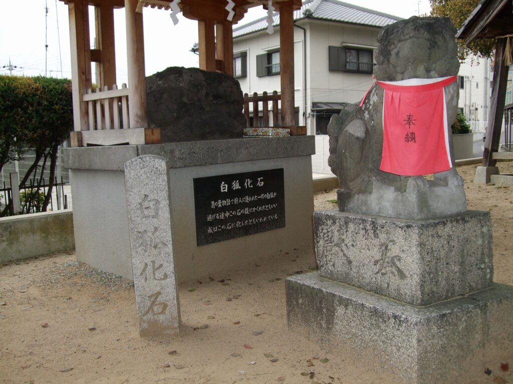 旧府神社の境内に葛の葉伝説ゆかりの「白狐化石(ばけいし)」がある。もともと熊野街道沿いにあったものを昭和二十二年に祀ったという。狩人に追われた白狐がこの石の後ろに隠れたとも石に化したとも伝えられている。白狐と国府。伝説か幻か,それとも現実世界の名残なのか。歴史的な思索に相応しい素材だ。