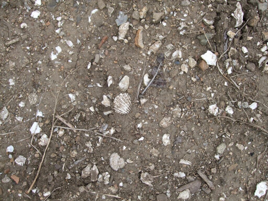 畑として耕された場所には,写真のように貝殻が散布している。中心に写っているのがハイガイだ。ハイガイはアカガイやサルボウの仲間だが,放射肋の数が少ないので見分けがつく。かつてハイガイは瀬戸内海で普通に見られていた。貝塚でなくとも干拓地で貝殻を拾うことができる。