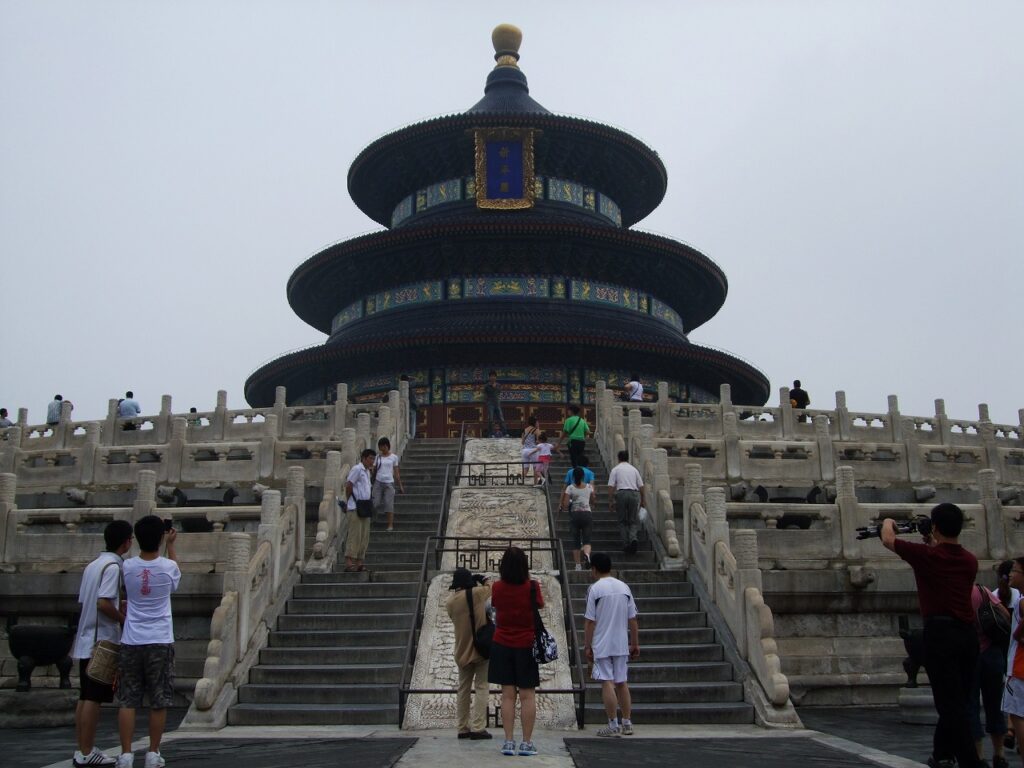 中華人民共和国北京市崇文区に「天壇」がある。天壇公園は広大で,ツアーで許された短時間では,とても見ることはできない。中でも写真の祈念殿がシンボル的建築物である。明の永楽帝によって原型が整備され,清代に至るまで代々の皇帝が天帝に五穀豊穣の祈りを捧げたという。紺の瑠璃瓦が鮮やかで印象深い。