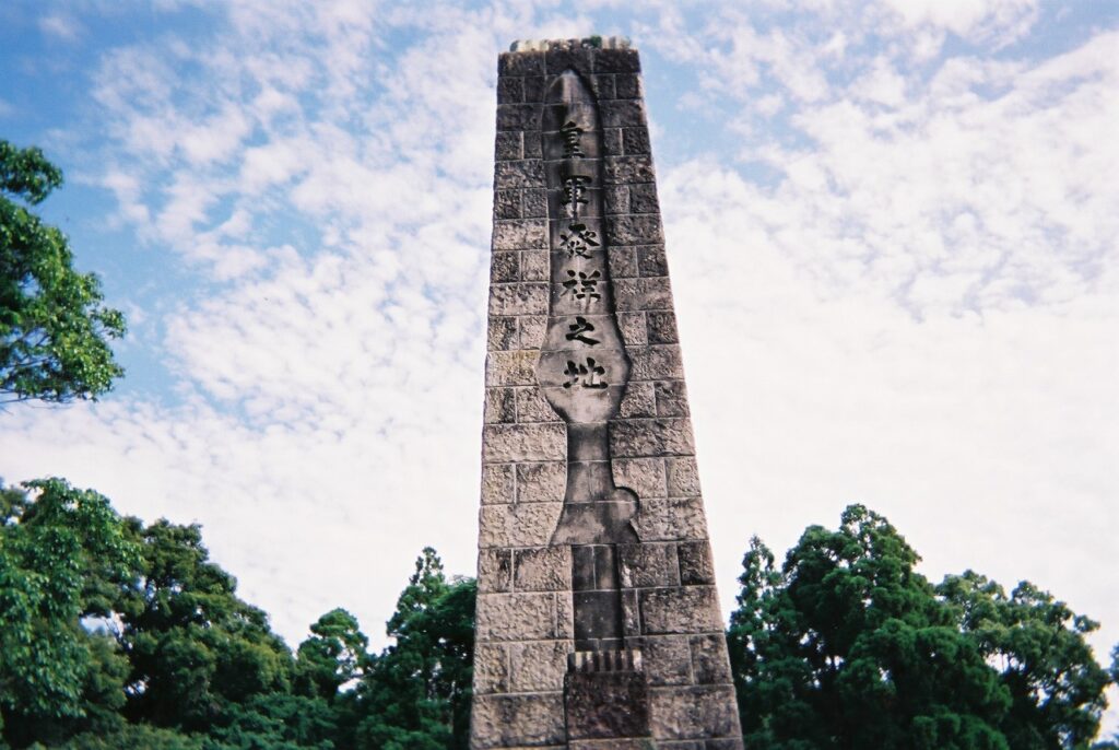 神社の南に「皇軍発祥之地」と刻まれた石塔が建てられている。紀元二千六百年を奉祝するモニュメントである。古代の鉾にかたどられた枠内の刻字は杉山元陸軍大将の書である。そういえば九州は銅鉾文化圏に属する。さらに杉山大将も九州出身である。大東亜戦争開戦時の参謀総長が揮毫した「皇軍」はこの地で生まれ,アジア・太平洋の各地で散っていった。
