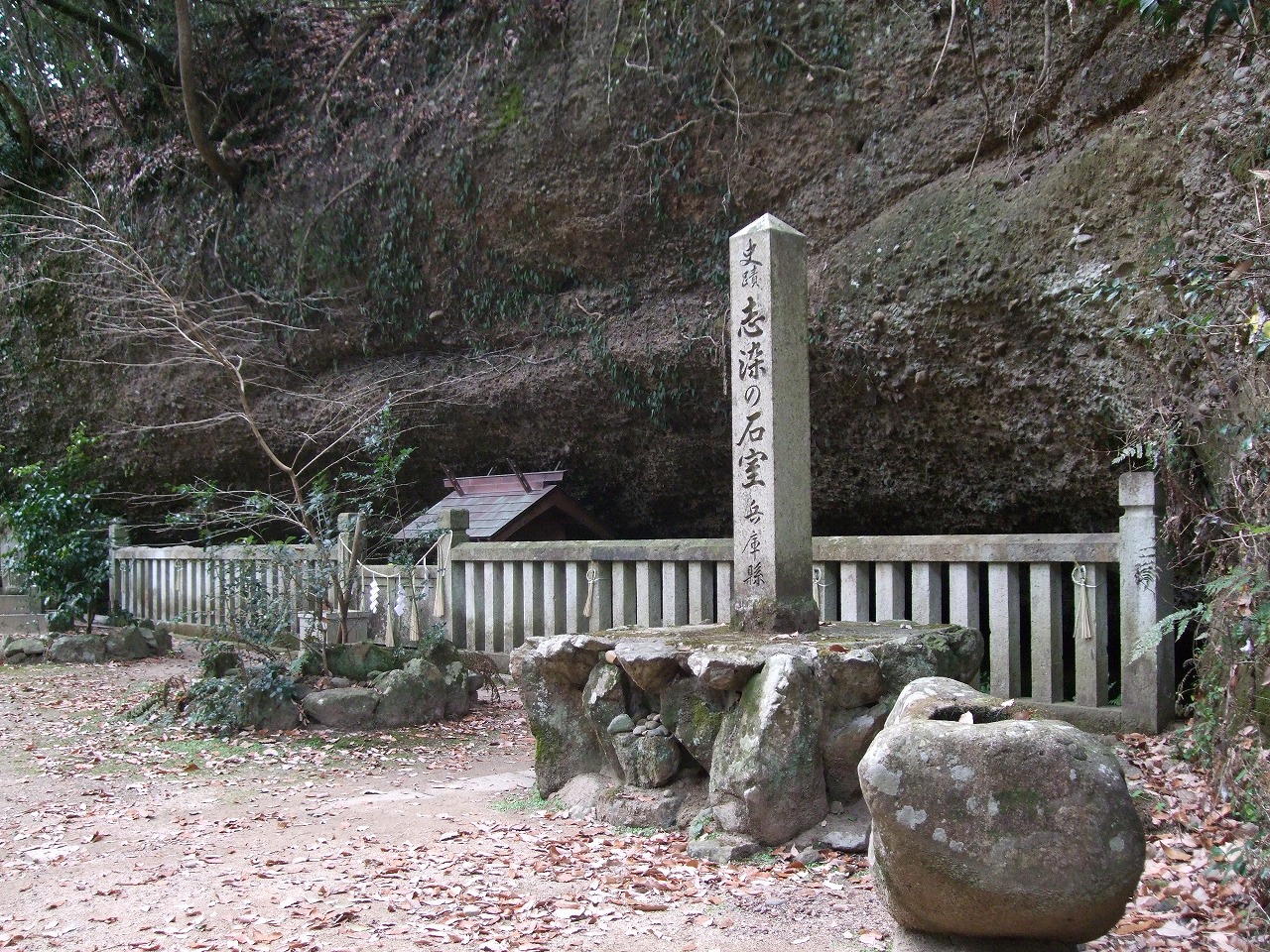 三木市志染町御坂に「志染(しじみ)の石室(いわむろ)」がある。ここは日本書紀にも「播磨国縮見山石室」として登場する古代からの聖域である。