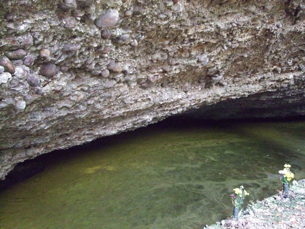石室には水がたまっている。この水は12月下旬~3月初旬に金色になることがあるそうだ。ヒカリモの作用によるもので「窟屋の金水」として知られている。この写真でも金色っぽく見えるが,一面が金に染まるのが「金水」である。そして,壁は礫岩でできている。今から3500万年前に古神戸湖に堆積して形成された神戸層群の一部である。