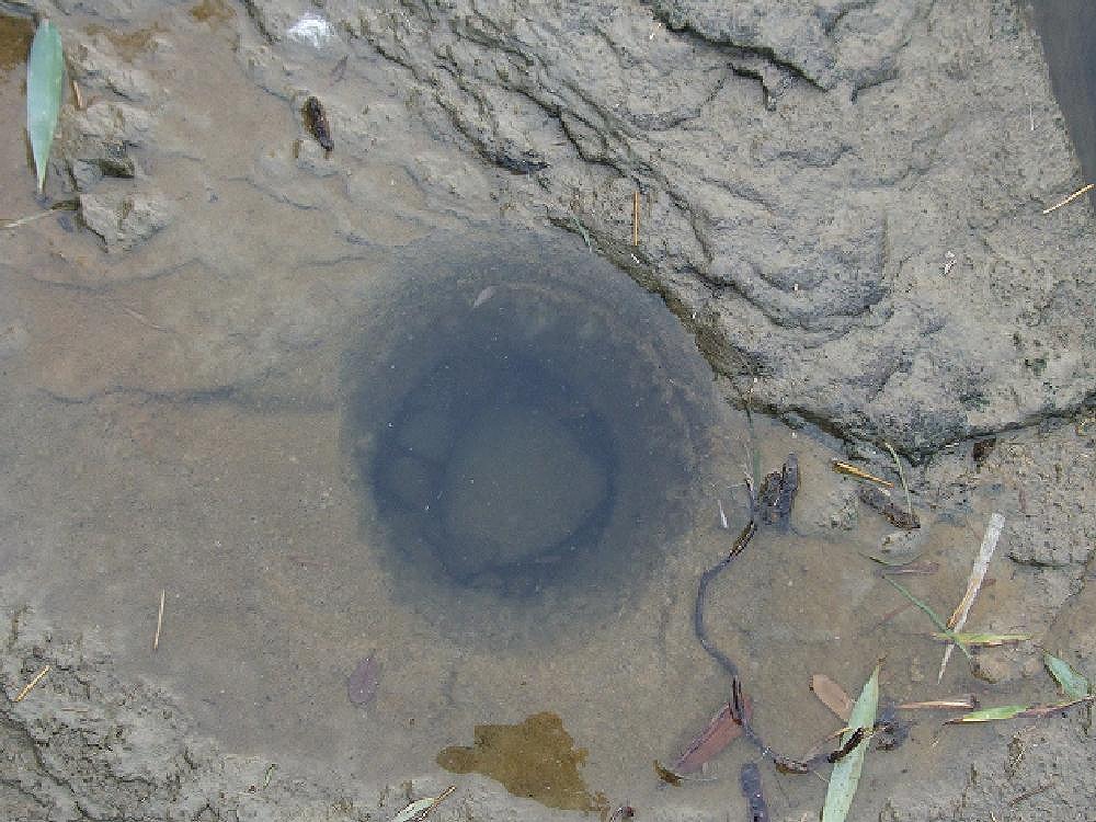 古神戸湖に溜まった火山灰が固まって凝灰岩となり,そこがいつしか川底となって,その川底の窪んだ場所にあった石が川の流れでクルクルと回転して深い穴を作った。穏やかな美嚢川。いったい何度激流となったのだろう。どれくらいの年月を経ているのか。火山灰はどこから噴出したのか。好奇心をくすぐる川底の穴である。