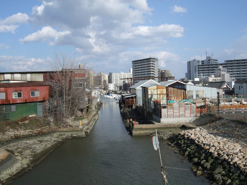 この写真の方向に伝法の旧市街がある。樽廻船に使われていた200~400石積みの船を「伝法船」と呼んだことからも水運が盛んだったことが分かる。