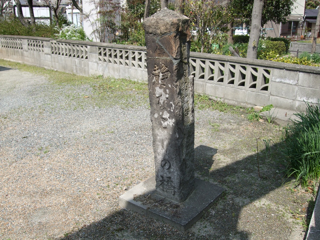 尼崎市東本町一丁目の辰巳八幡神社の境内に「傳静なごりの橋」の石柱がある。「昭和大典記念」とも刻まれているが,年代の割にはずいぶん傷んでいる。