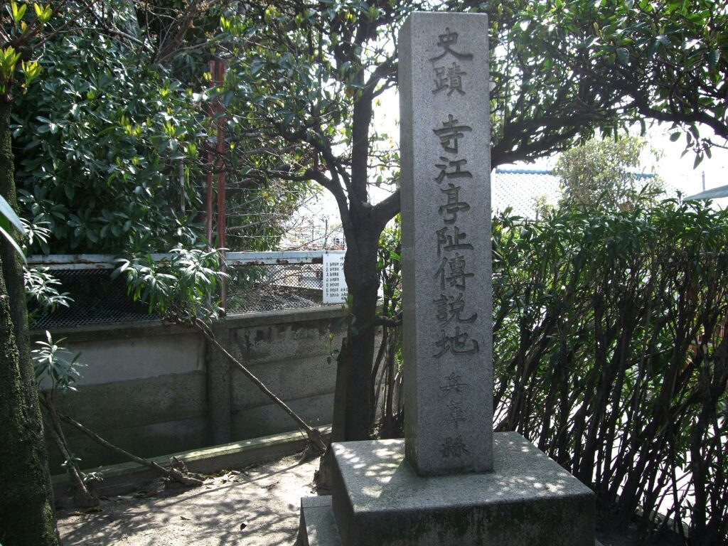 尼崎市杭瀬寺島2丁目に「寺江亭阯傳説地」の標柱があり,その隣に「聖趾不滅」と坂千秋(第27代兵庫県知事)が揮毫した石碑が建てられている。