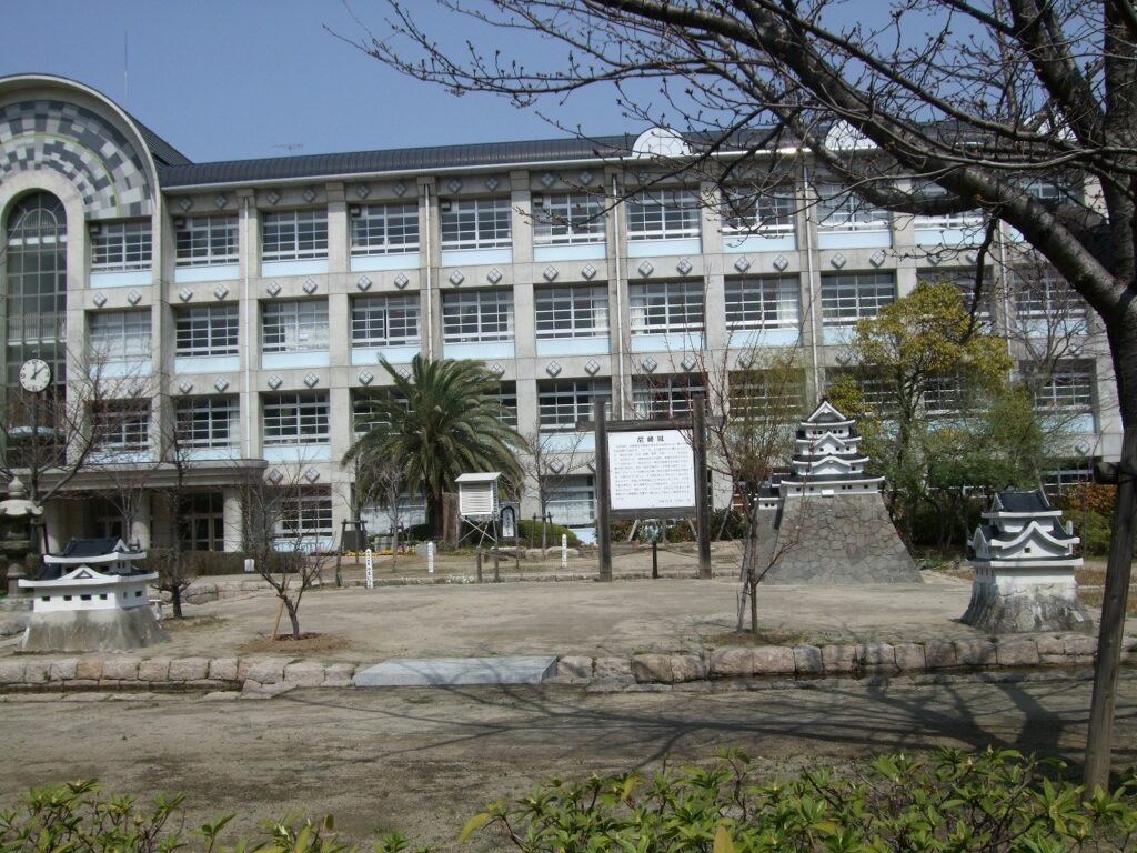 江戸時代、尼崎城は大阪城の西を守る役目のため譜代(ふだい)大名 戸田氏鉄(うじかね)が元和(1617)から数年かけて築いたものです。領地は4郡(川辺・武庫・兎原(うはら)・八部(やたべ))111村の広さで5万石でした。城域は現在の北城内、南城内の約300メートル四方あって、西は庄下川、東は大物運河を外堀とする三重の堀に囲まれ、本丸(現在の城内小・中学校々庭内)には、高さ18メートルの四層の天守閣(現在の城内中学校正門東付近)が築かれていました。その姿は海上に浮かんでいるように見えたので、浮城とか琴浦城などと呼ばれたそうです。この天守閣の模型は、昔の写真をもとに木形を作り、コンクリートで固めたもので、昭和15年(1940)4月から7月まで1学期間かけて教職員と児童が一緒になって 苦心して製作されたものです。