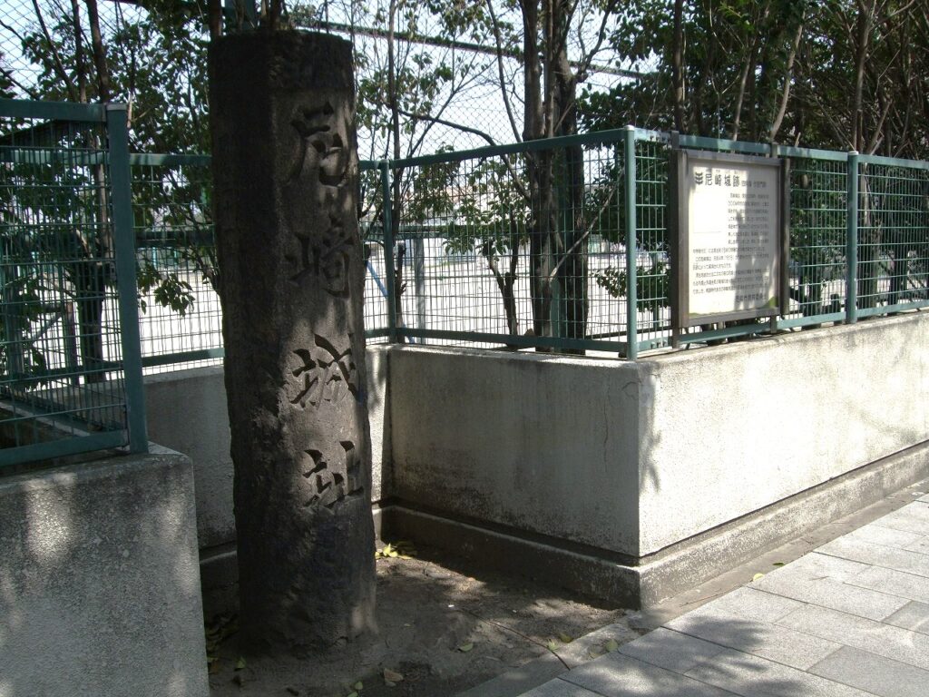 尼崎市南城内の尼崎市立明城小学校の隅に「尼﨑城址」の石碑が建てられている。石丸みを帯びているのは,旧城橋脚の柱石を利用しているからだそうだ。「昭和大典記念」とも刻まれているので,昭和初期の建碑である。