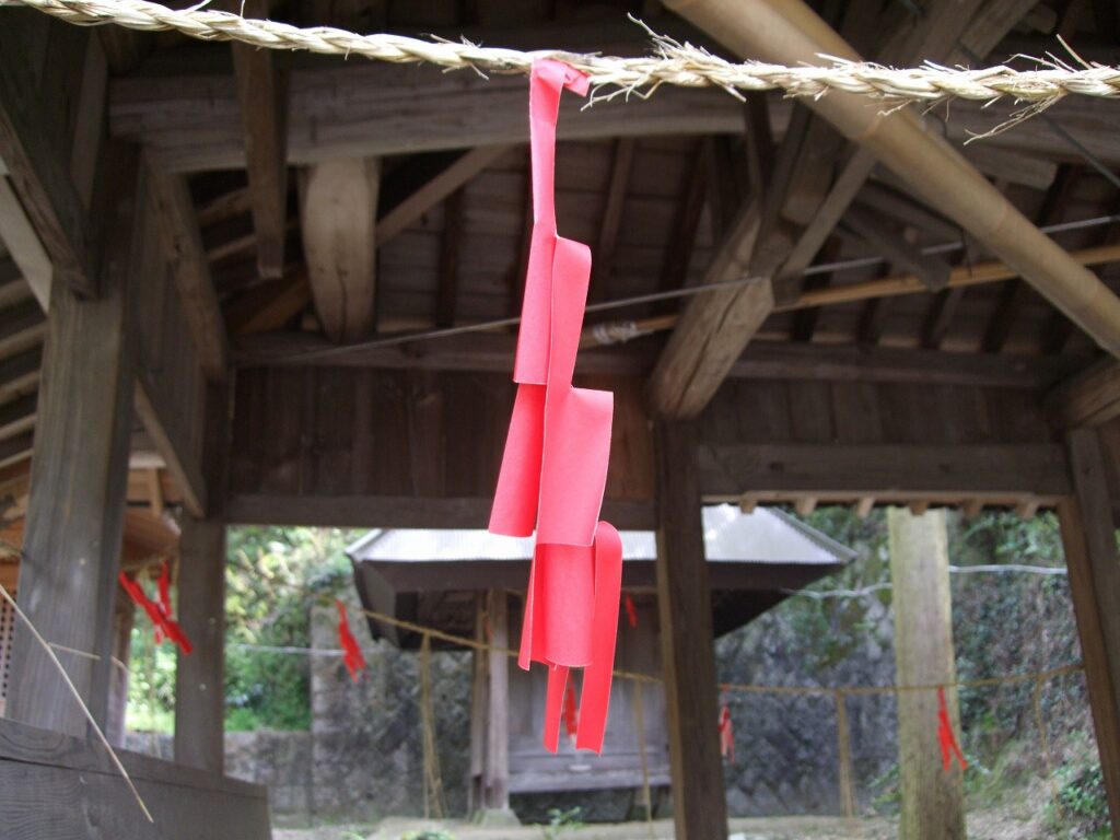 福山市沼隈町大字中山南に「赤幡(あかはた)神社」がある。普通は白の紙垂(しで)が、ここでは赤だ。平家の赤旗を祀ってあるという。