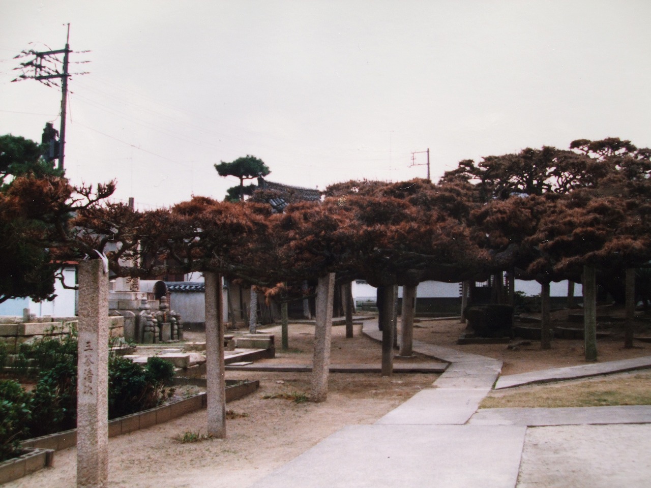 この寺は三備に日蓮宗を布教した大覚大僧正を開基とする古刹で、天蓋松は大僧正お手植えの松だったそうだ。表精『鞆今昔物語』は、かつての姿を次のように描いている。