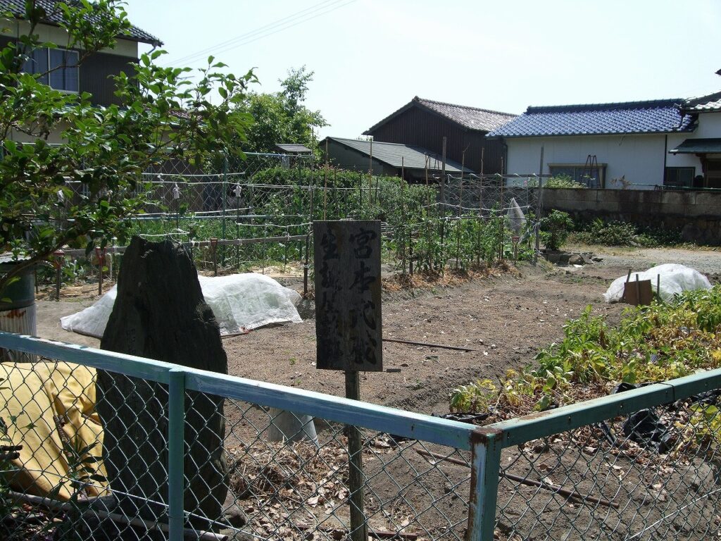 「生家跡」も特定できると史跡の価値が高まる。板看板に「宮本武蔵生誕屋敷跡」と示されている。隣の石碑には「宮本児童公園」とあるが、なぜか畑の中にある。