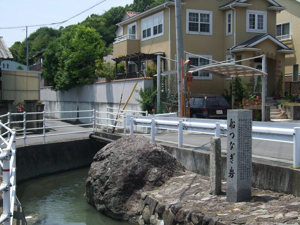 神功皇后征韓の時、この大岩に船をつないだと言われる。これより南方に縄文や弥生遺跡がある事から、神功皇后は神話伝説上の人物で、附近はもっと古くから陸地であった筈。或いはこの小川がもっと川幅があり、大津茂川から舟運した時代もあったであろう。ともあれこの地方の海岸地帯には神功皇后の伝承が多く、その一つであろう。