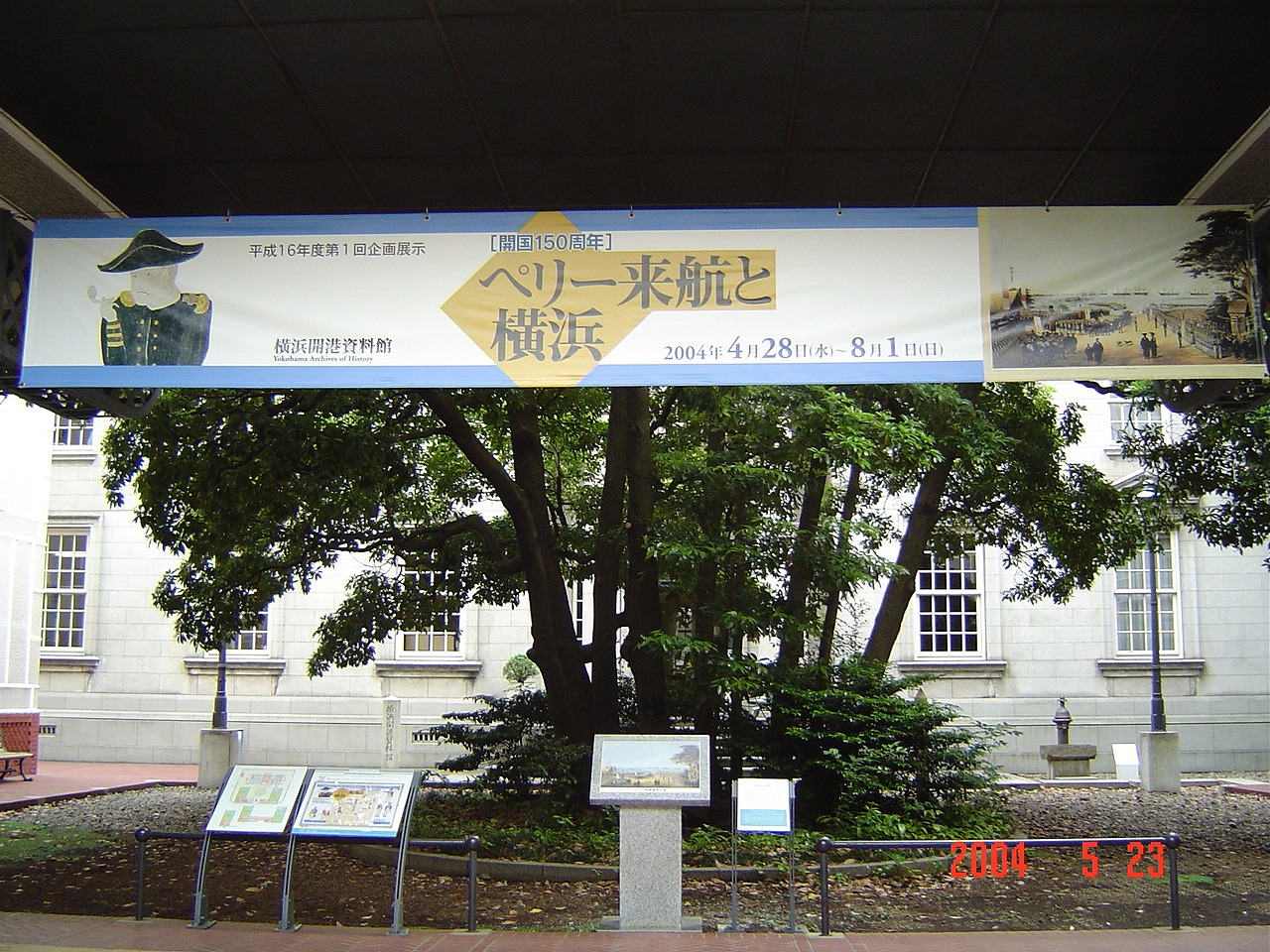 私がここを訪れたのは2004年、横浜開港資料館では「開国150周年 ペリー来航と横浜」という企画展示が開催されていた。そのときから150年前の1854年3月8日(嘉永7年2月10日)、アメリカ東インド艦隊司令長官マシュー・ペリーが約500人の武装水兵を率いて横浜に上陸した。その時の模様は当資料館所蔵の「ペリー提督・横浜上陸の図」(随行画家ハイネ原画による石版画)で知ることができる。上の写真を見ると、企画展示の横断幕の右部分に、その絵が印刷されている。