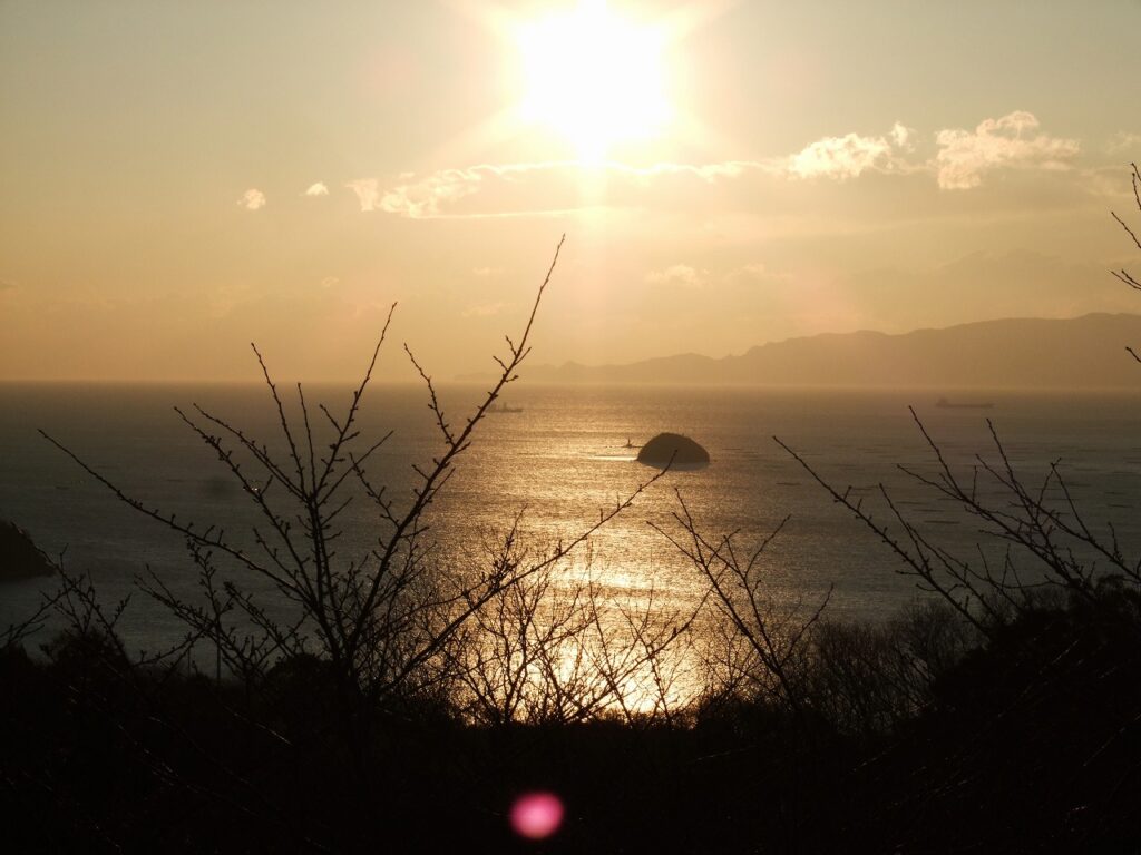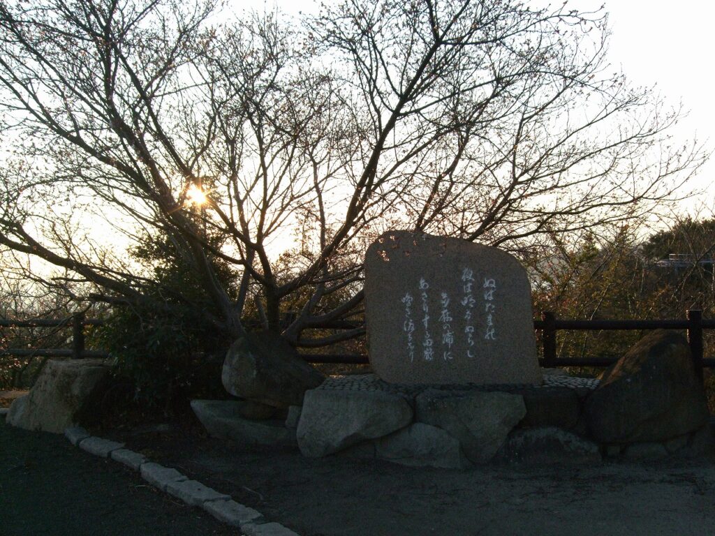 初日の出の太陽は播磨灘を黄金に染めながら高度を増していった。写真中央の丸い背中の島は鼠島という。こんな光景は今も昔も変わらないだろう。「多麻の浦」はこの辺りだったのか。浅海で塩田化された錦海湾もすぐ近くだ。多麻の浦の候補となるいくつかの土地には、尾道(千光寺公園に歌碑)、倉敷市玉島(玉島文化センターに歌碑)、玉野市玉があげられる。鶴の声で夜明けを知るとはなんと情趣のあることだろうか。