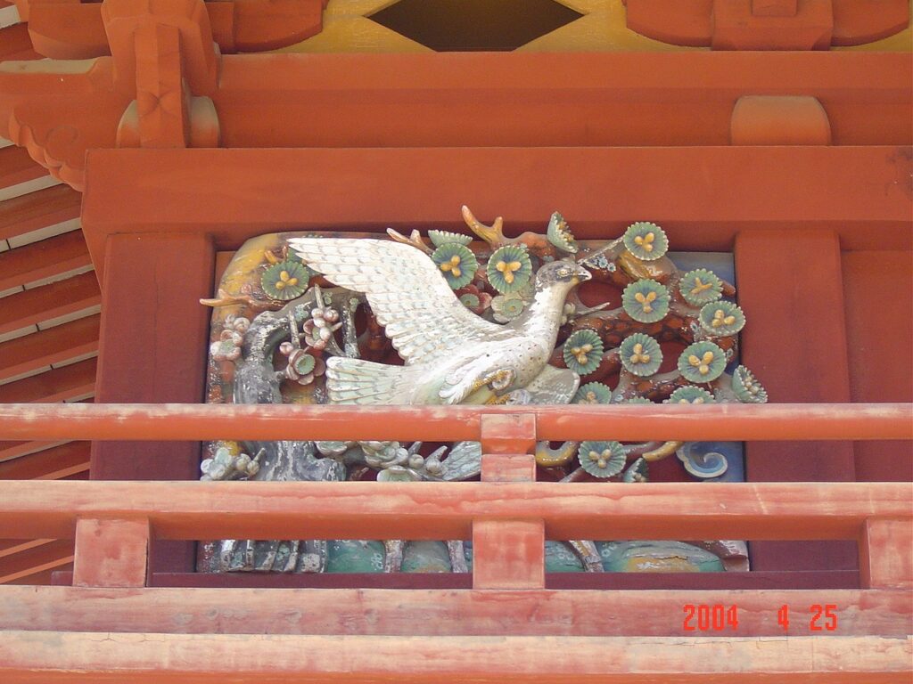 この門には、前面に竜、背面に鷹の彫刻が二個ずつはめ込んである。飛騨の名工左甚五郎の作と伝えられ、あまりにできばえが見事なので境内の鳩は恐れをなしたのか、この山門にだけは全然寄り付かないという。