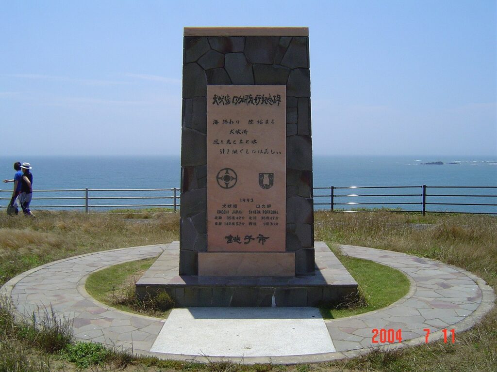 ユーラシア大陸の東 銚子市とはるか西方ポルトガル共和国シントラ市はほぼ同緯度に位置し、それぞれ、海終わり陸始まる犬吠埼・陸終わり海始まるロカ岬の記念碑があります。