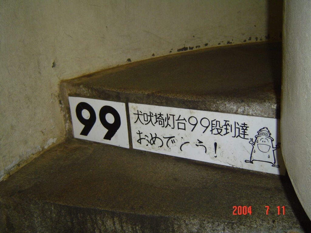 この風景を見るために灯台に登ったのだ。銚子市観光協会のパンフレットには「地球の丸く見えるまち」とのキャッチフレーズがある。地球を見ることができる貴重なビュースポットなのだ。灯台内の階段は99段である。九十九里浜にちなむとも言われている。クルクル回って飽きたころに写真のようなメッセージがあって元気づけられる。