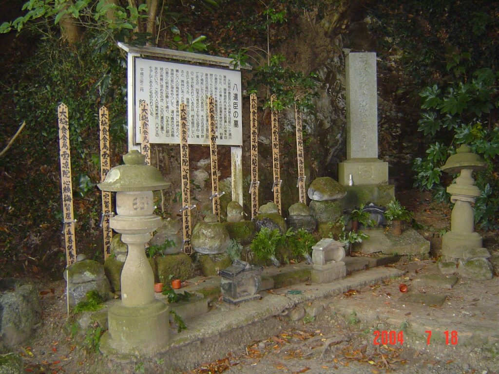 大坂城の豊臣方との決戦を目前にした徳川幕府は、関東御府内外様大名取潰しの策を回らせた。この策により改易を命ぜられ、伯耆の倉吉に移された房総里見氏十代忠義は、憂悶のうちに元和八年(一六二二)二十九歳で倉吉在の堀村に卒した。この悲運の主君に従って殉死した八人の家臣は、その氏名は不詳であるが、四字の戒名の上と下に必ず心・賢の二字が配されているのは、何を暗示しているのであろうか。慈恩院に伝えられた話によると、房州にあった里見氏の遺臣が、主君忠義と八人の殉死者の遺骨を房州に持ち帰るべく漁師の姿に身をやつして、遙々倉吉の大岳院の墓から蛸壺に分骨して帰り、ひそかに館山城の南麓に埋めたのが、この八遺臣の墓であるという。この八人の殉死者が、八犬士のモデルであるとも伝えられている。 平成三年二月 館山市