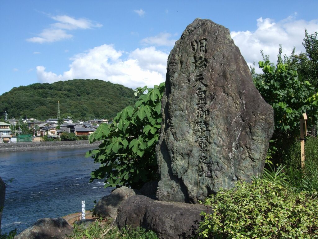 宇治市宇治蓮華に「明治天皇御駐輦之地」と刻まれた石碑がある。緑の山に緑の草、そして緑の石。白い雲に青い空、そして青い川。三色から成る夢のような景色である。夢浮橋の古蹟が側にある。