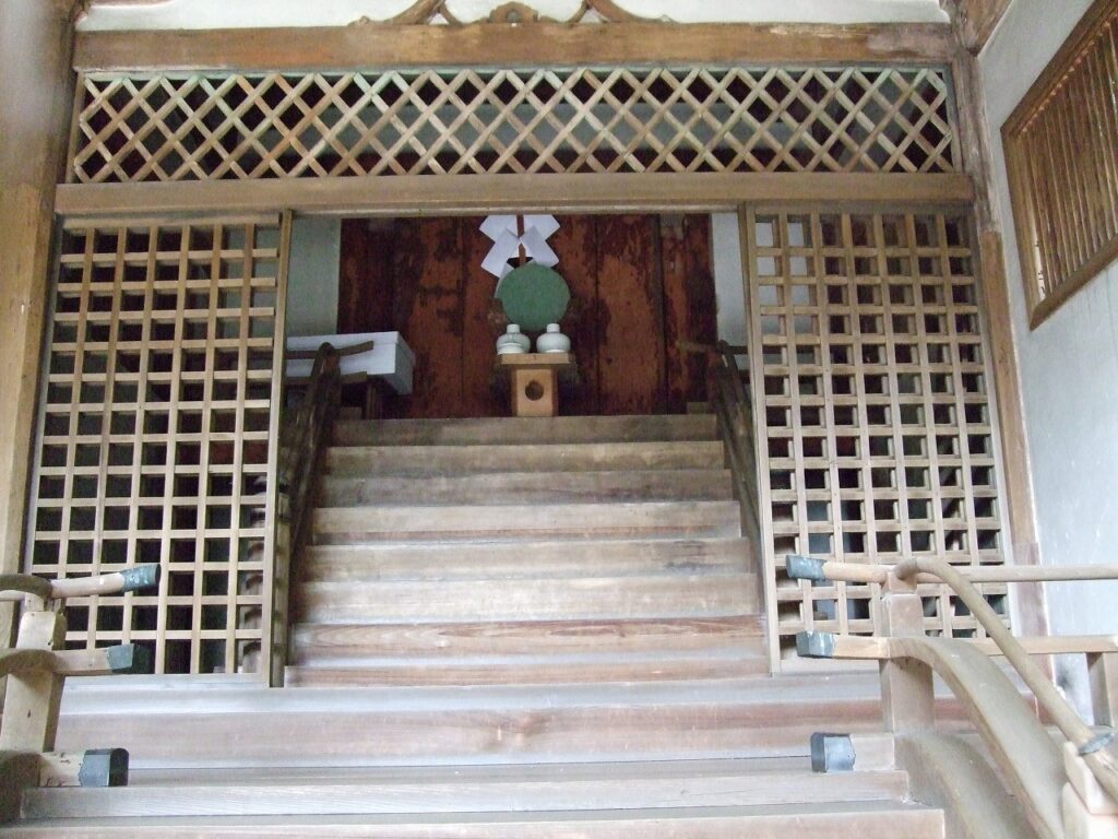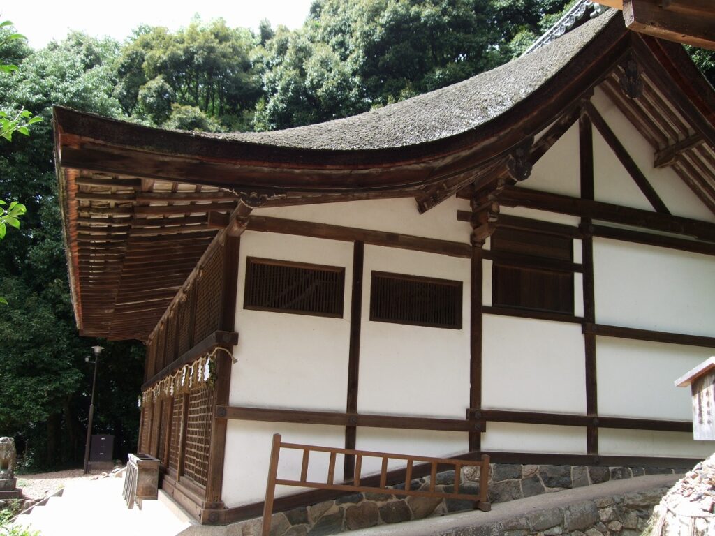 本殿は覆屋(おおいや)と内殿三社から成り、下の写真は内殿のうち向かって右の左殿である。もう少しレンズを上に向けていれば「蟇股(かえるまた)」が写ったはずだ。足先しか見えないが、醍醐寺薬師堂中尊寺金色堂と並ぶ三名蟇股だそうだ。