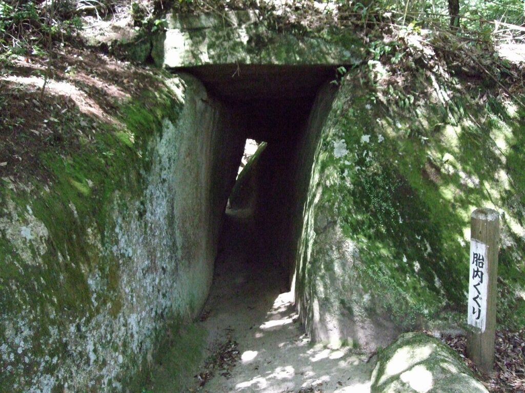 行場入りする前に「胎内くぐり」で身を清める。天井は切石で覆ってあるが、元は大きな自然石だったそうだ。安政の地震で谷間に滑り落ちてしまったという。