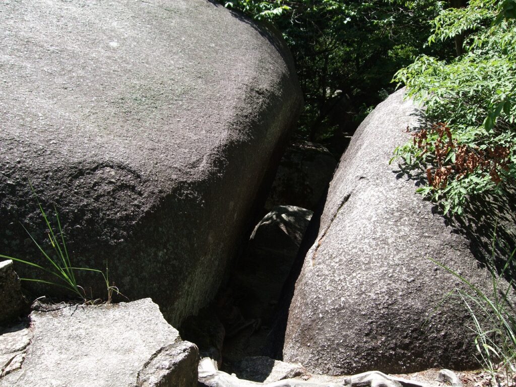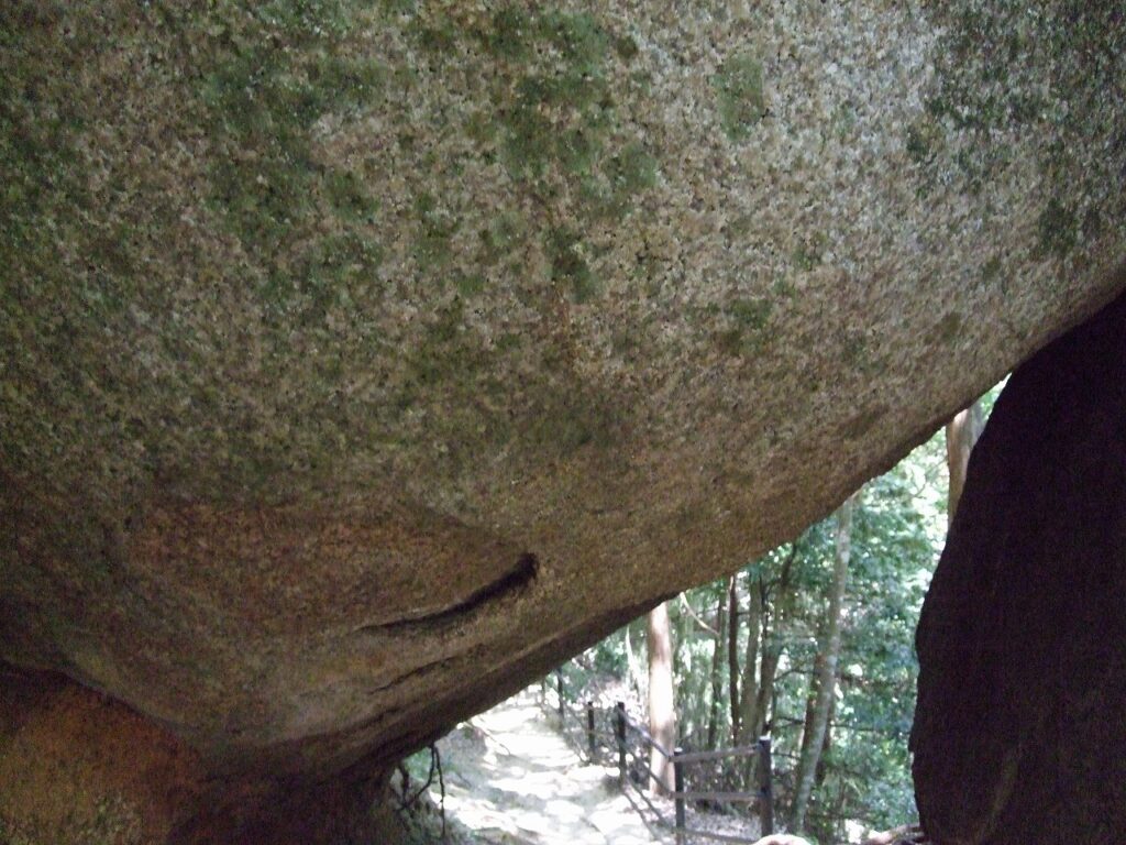 まずは「太鼓石」である。たたくと音がする、当たり前じゃん、ではない。ペタペタではなくポッと籠ったような音のする部分があるのだ。おそらくは写真の部分の空洞で反響しているのだろう。どこが修行なのか、ではない。音の響く部分を探すのが大変なのだ。