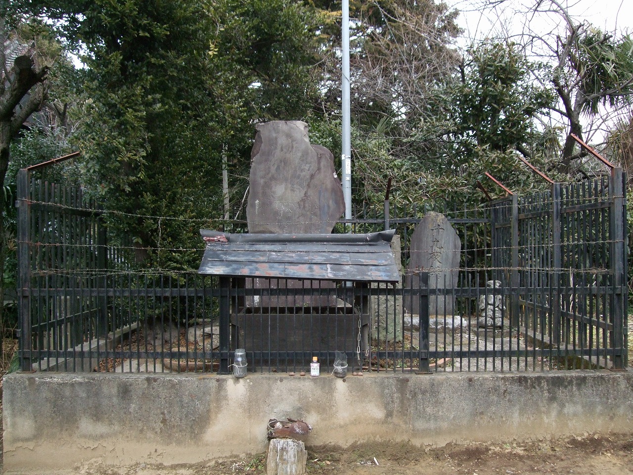 そういえば、人を寄せ付けないように石碑の周囲が柵や有刺鉄線でものものしく囲われている。どんな騒ぎだったのか。かるたの解説を読んでみよう。