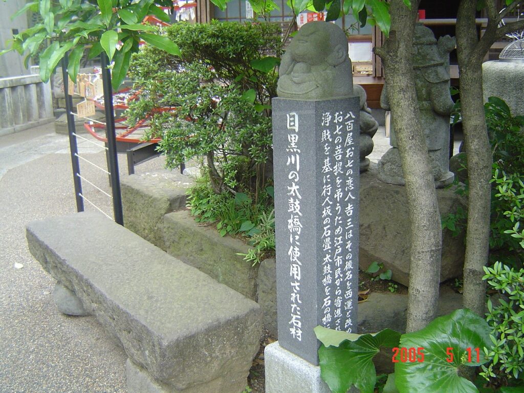 八百屋お七の恋人吉三はその後名を西運と改めお七の菩提を弔うため江戸市民から寄進された浄財を基に行人坂の石畳、太鼓橋を石の橋にした。