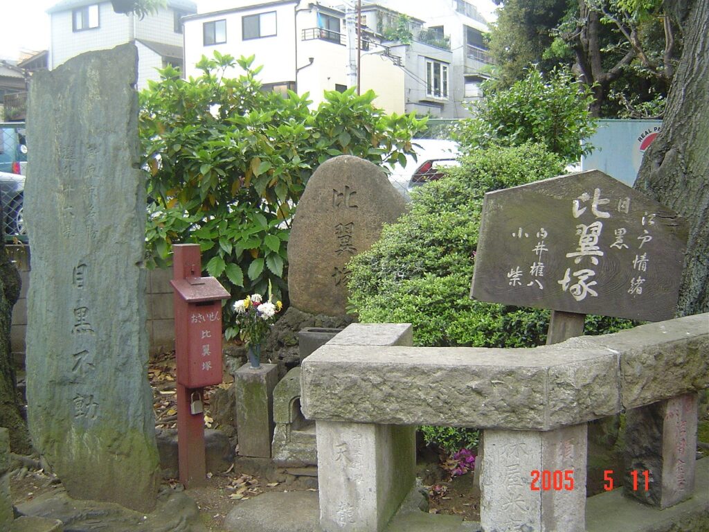 比翼塚は愛し合って死んだ男女を一緒に葬った塚のことで、心中事件など悲恋物語が背景にあることが多い。目黒の比翼塚の白井権八とは、歌舞伎に登場する人物で実名は平井権八という。小紫との物語は「権八小紫物」として歌舞伎界ではよく知られた演目だそうだ。『世界大百科事典』(平凡社)で「権八小紫物」の項を読んでみよう。