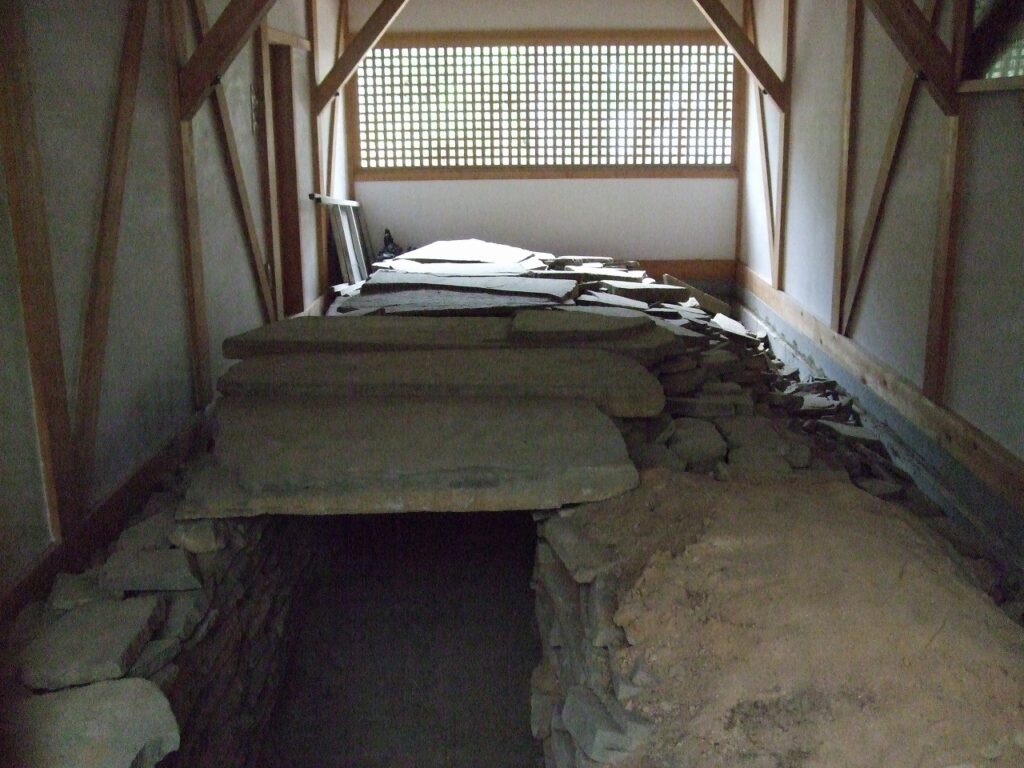 長い間石室を保護した覆屋ですが、平成7(1995)年の震災によって傾いたのを機に覆屋再建が計画されました。地域の方々の寄付を基盤に平成14(2002)年12月、覆屋が完成しました。このような貴重な竪穴式石室が保存され見学できるのは郷土の誇りです。