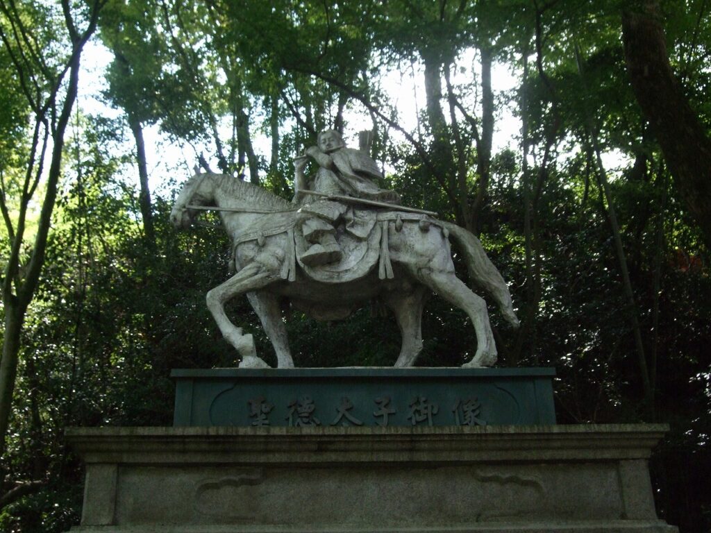 完成は昭和54年である。戦前にも同様な像があったが戦争で供出されてしまったようだ。これまたもしやと思い、ヤフーのオークションで検索すると「大和信貴山聖徳太子御尊像」という古い絵葉書が出品されていた。その写真を見ると、騎乗し横笛を吹く武装像で、似てはいるが勇ましさも兼ね備えて、いささか今とは趣を異にした太子像があったことが分かる。