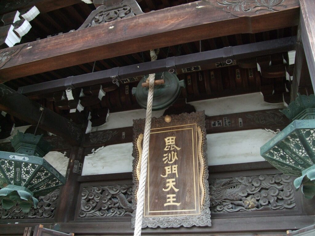 本堂には「毘沙門天」を祀っていることを示す扁額が掲げられている。よく見るとムカデがいるが、これは毘沙門天のお使いだそうだ。