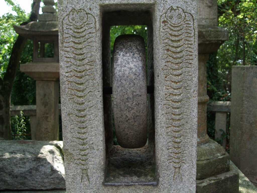 輪廻というのは仏教の根幹をなす思想の一つだが、形にすると下の写真のような石の車輪となる。輪廻車といい、六道の世界に生滅を繰り返す生きとし生けるものの姿を表している。