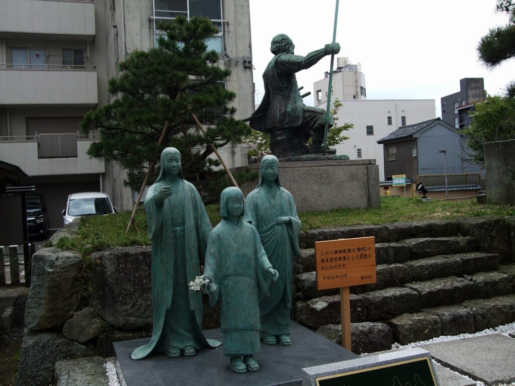 柴田神社は柴田勝家の北ノ庄城があった場所である。柴田神社はもちろん柴田勝家を祀るが、三姉妹神社のほうは、日本史上最も有名な三姉妹である下の写真の方々を祀っている。数奇な運命に彩られたとは、まさにこの浅井三姉妹のことであろう。背の高い順に茶々(14)、初(13)、江(10)である。