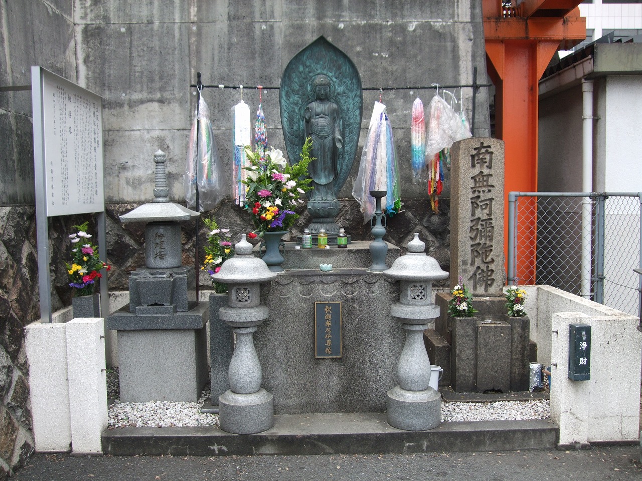 太平洋戦争終戦前日の昭和二十年八月十四日、大阪は最後の大空襲を受けた。B29戦略爆撃機は特に大阪城内の大阪陸軍造兵廠に対し、集中攻撃を加えたが、その際、流れ弾の一トン爆弾が四発、京橋駅に落ちた。うち一発が多数の乗客が避難していた片町線ホームに高架上の城東線(現、環状線)を、突き抜けて落ちたため、まさに断末魔の叫びが飛び交う生き地獄そのものであったという。判明している被爆犠牲者は二百十名であるが、他に無縁仏となったみ霊は数え切れなく、五百名とも、六百名とも言われている。