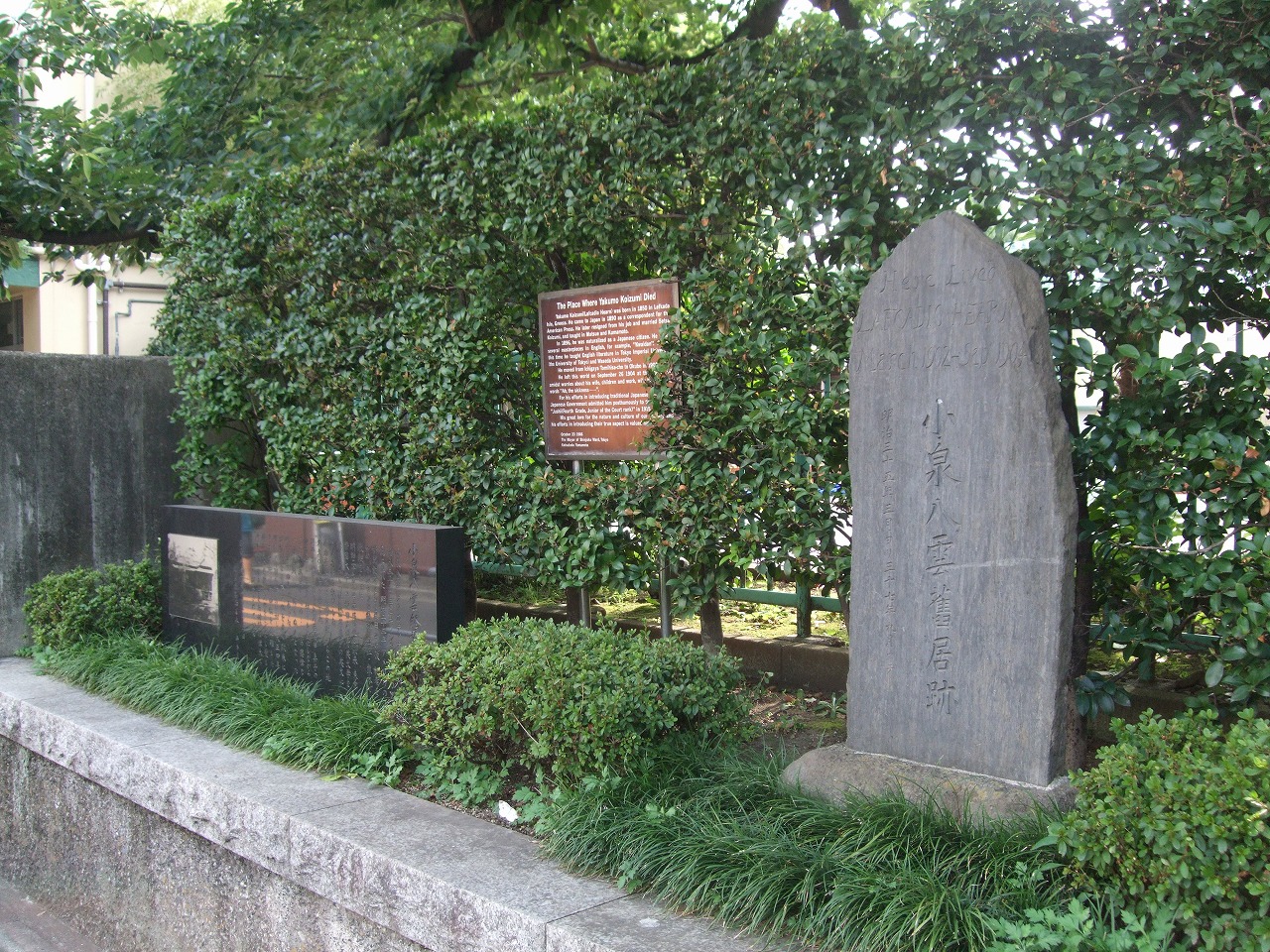 新宿区大久保一丁目の区立大久保小学校前に「小泉八雲旧居跡」の石碑がある。「明治三十五年三月ヨリ三十七年九月マデ」と八雲が過ごした期間も刻まれ、解説碑には旧居の写真(下写真参照)が焼きつけられている。