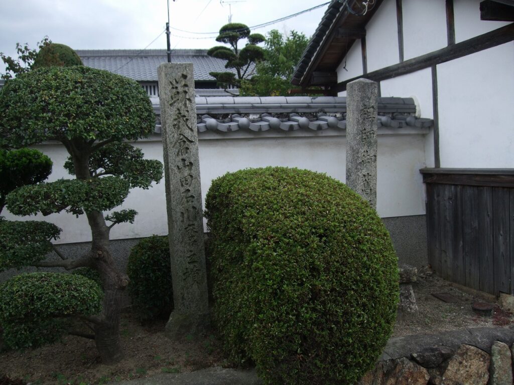 石川麻呂のものと伝えられる墓は、上記太子町大字山田の仏陀寺古墳の他に、岐阜県各務原市指定史跡の「伝蘇我倉山田石川麻呂の墓」が同市蘇原宮塚町2丁目にある。蘇原寺島町1丁目には県指定史跡の「山田寺跡及び礎石」がある。また福井県越前市粟田部町にも「右大臣蘇我倉山田石川麻呂の廟」がある。石川麻呂から53代目の子孫の山田重貞が建立した。石川麻呂末子の清彦が越前に流罪になっていたのである。何が本当なのかわからないが、とにかく「山田」がキーワードになりそうだ。