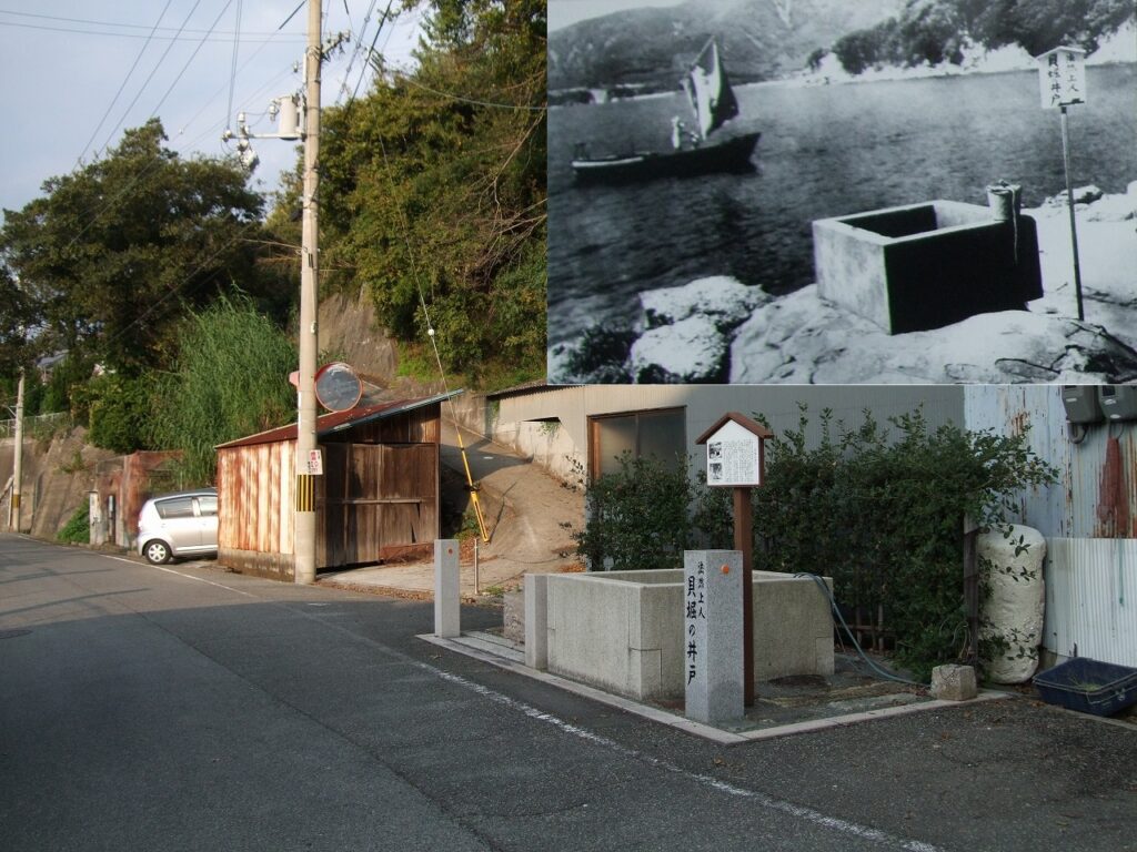 浄運寺から海側に降りた所にある貝堀の井戸は、室津に滞在中の法然上人が飲み水で困っている室津の人々のために、海辺の貝で掘ったという言い伝えが今でも残っている淡水の井戸です。