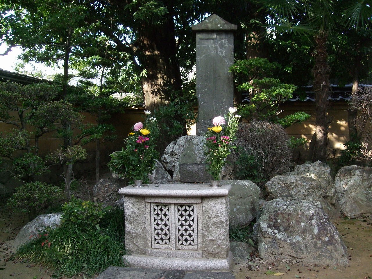 墓地の東側には、土壇の上に一・七m四方の格子塀に囲まれた宝形(ほうぎょう)銅葺屋根木造彩色の位牌堂があり、その中に父子の位牌が安置されている。