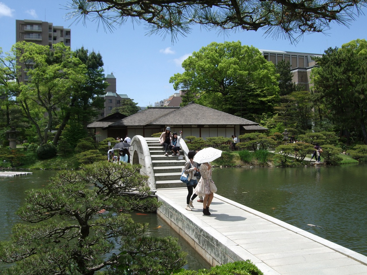 縮景園の跨虹橋は、広島藩第七代の浅野重晟(あさのしげあきら)が京都の名工に二度も築きなおさせたものと言われている。縮景園を代表する景勝で、現代にも通用するスタイリッシュなデザインである。実は、この名橋はあの原子爆弾をくぐり抜けるという試練を経てきた。
