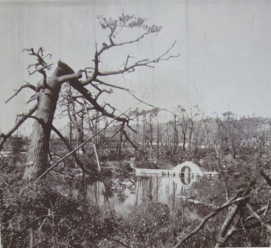 この庭園は、1620(元和6)年、広島藩主浅野家の家老上田宗箇(そうこ)により藩主の別邸として設けられました。戦前は市民に「泉邸(せんてい)」の名称で親しまれていましたが、人類史上最初の原爆投下により、このように無残な姿となりました。被爆直後、数多くの被災者がここに避難してきましたが、治療もほとんど受けることができないまま息絶え、その遺体は園内に埋葬されました。