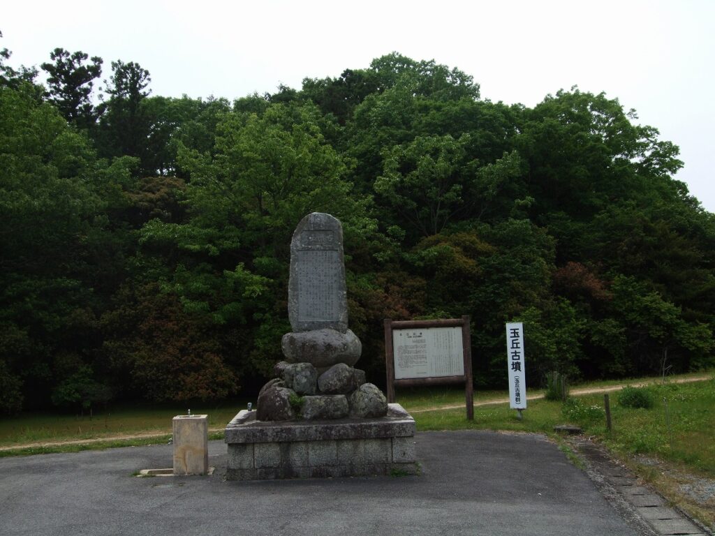 そのような学術的なことは近年の説明板に記されている。説明板手前の石碑は大正15年建立の「玉丘碑表」で、古墳が天皇家ゆかりであることが記されている。大正年間に貴人の墓とは知らずに「塋域(えいいき)を冒せる者ありし」ということで、石碑を建て後世に伝える旨も記されている。