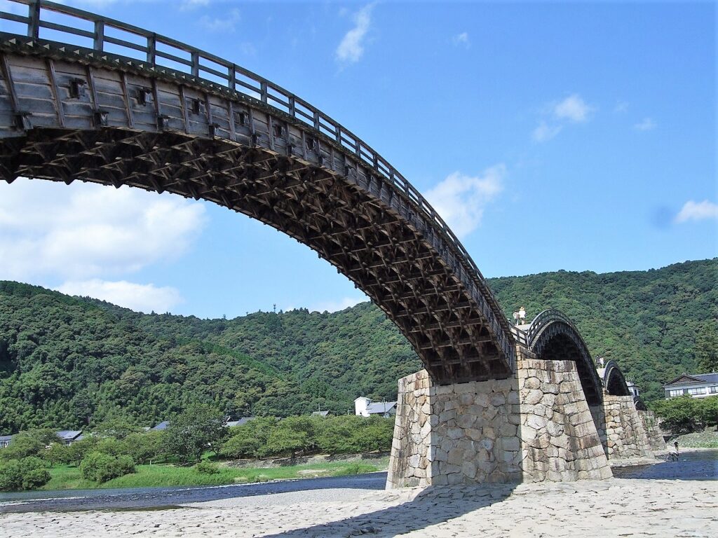 錦帯橋は第3代吉川広嘉(きっかわひろよし)によって延宝元年(1673)に架橋された。翌年に一度流され再び架橋、この橋は昭和25年9月14日のキジア台風による洪水で流失するまで276年間の不落を誇った。「新日本観光地百選」の部門首位となったのは、流失後間もない10月10日であった。